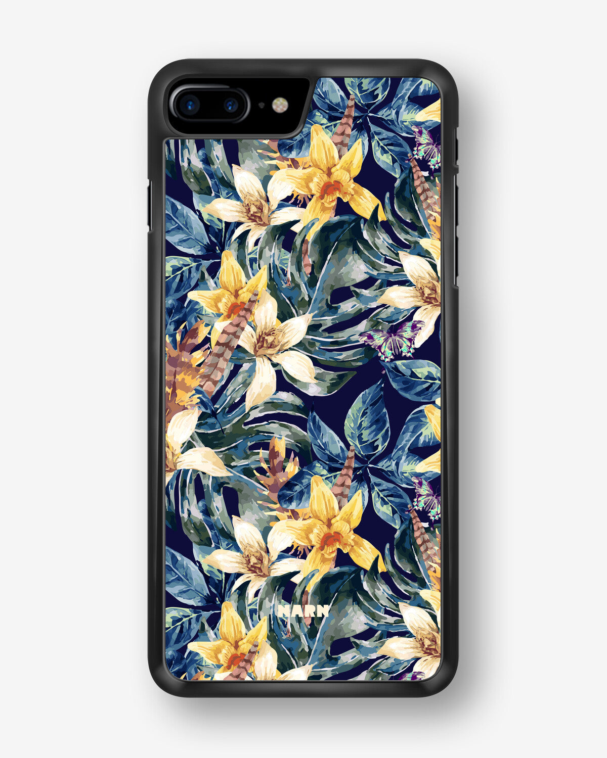 This design features: leaves, butterflies, daffodil, exotic, monstera