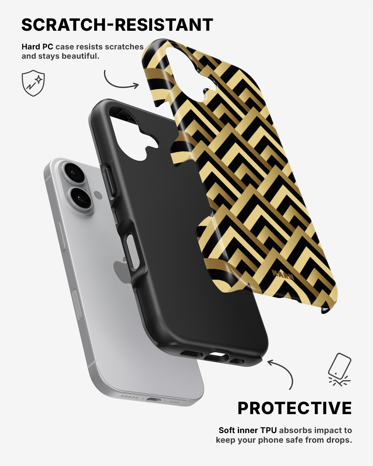 Meet the Tough Case for iPhone 16 Plus in the pattern: Goldline. Strong on the outside, soft on the inside. This case is made to protect your phone from daily drops, scratches and surprises while keeping it stylish.