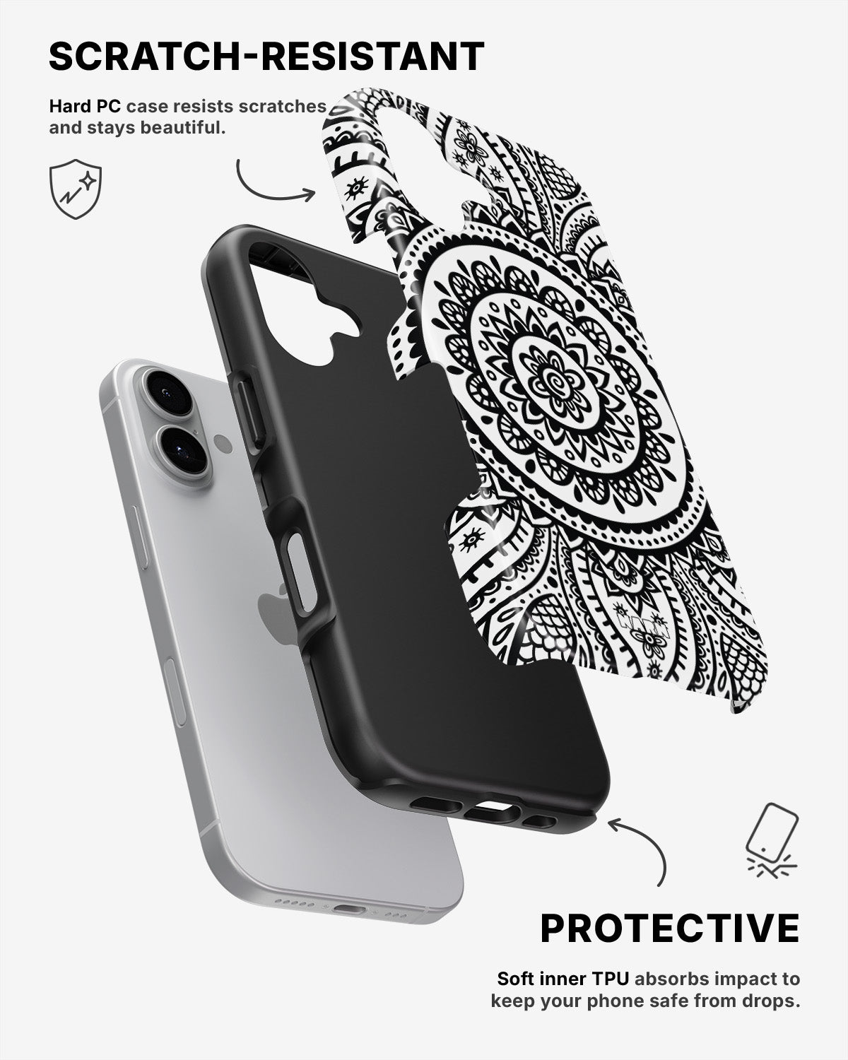 Meet the Tough Case for iPhone 16 Plus in the pattern: Henna Mandala. Strong on the outside, soft on the inside. This case is made to protect your phone from daily drops, scratches and surprises while keeping it stylish.