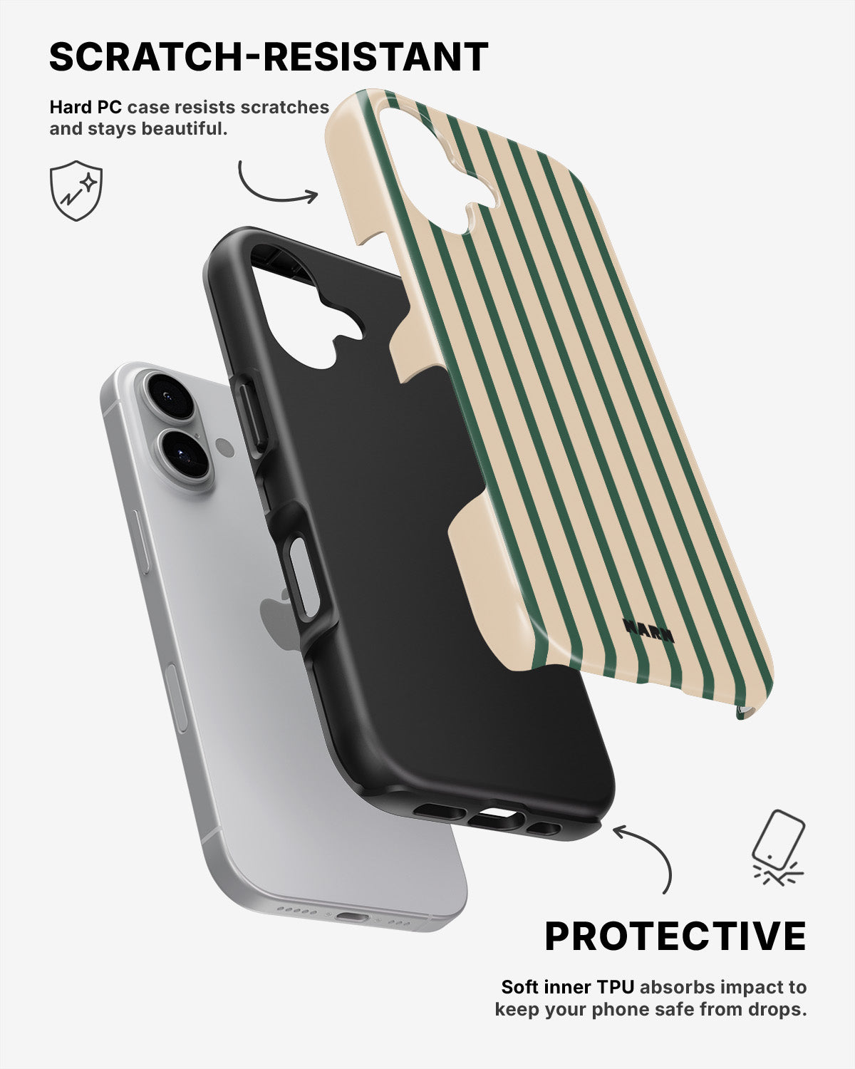 Möt Tough Mobilskal för iPhone 16 Plus i mönstret: Evergreen Stripe. Tufft på utsidan, mjukt på insidan. Det här skalet är gjort för att skydda din telefon mot vardagens tapp, repor och överraskningar – samtidigt som den ser stilren ut.