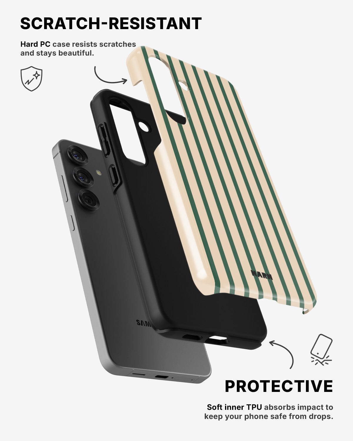 Det hårda bakstycket i polykarbonat (PC) håller motivet levande och motståndskraftigt mot slitage, medan insidan i TPU ger stötdämpning och ett bekvämt grepp. Ett skal som känns tryggt i handen och ser rätt ut överallt.